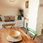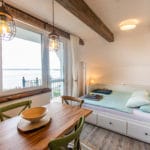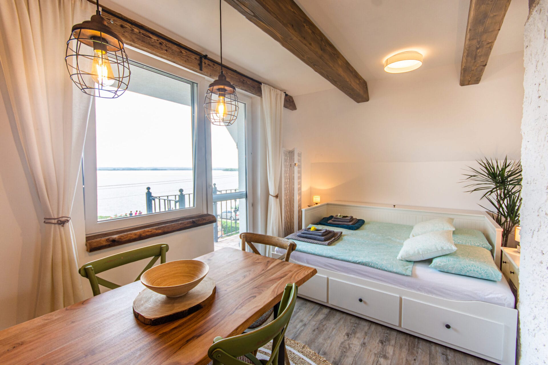 V apartmánu vonícím dřevem máte kuchyň s vybavením i velký jídelní stůl hned u okna a s výhledem na vodní hladinu. Necháváme na vás, jestli si na něj rozložíte skleničky s vínem při večerním odpočinku, nebo třeba dobroty, které si nakoupíte cestou po okolí nebo u nás ve snídaňovém baru. V každém případě zveme k využití balkonu a terasy s venkovním grilem.